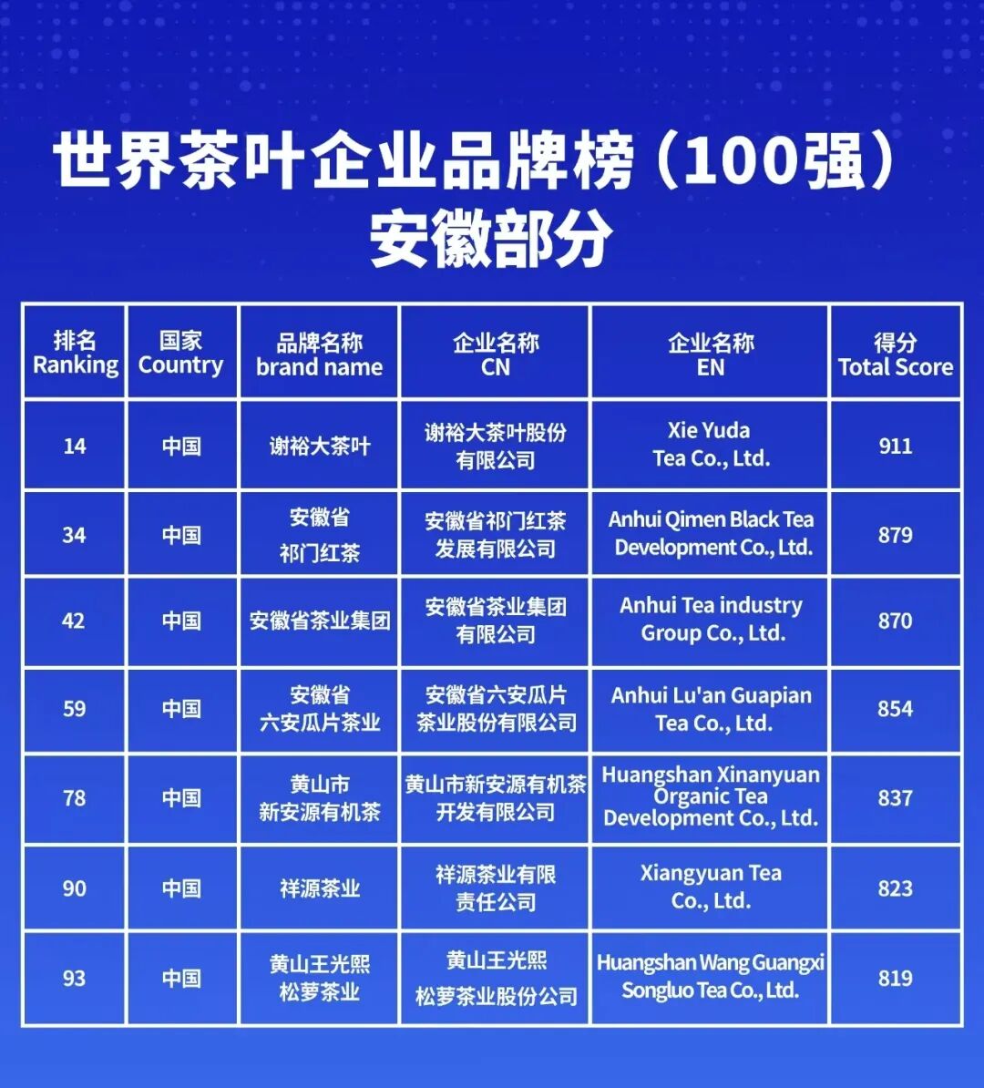 日前,在福建武夷山举办的“聚焦国际茶叶品牌建设,共促茶产业高质量发展”主题活动上,国际品牌科学院正式发布了世界茶叶企业品牌榜(100强)、世界茶叶(省级)产区榜(30强)、世界茶叶(县级)产区榜(100强)三份《世界茶叶品牌评价榜单》。其中,谢裕大荣登“世界茶叶企业品牌榜(100强)”,位列全球第14位,高居徽茶品牌首位,充分展现了谢裕大品牌的国际竞争力。