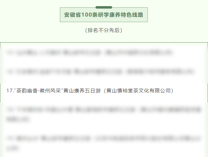 近日,由安徽省卫生健康委、省文化和旅游厅指导,省健康文化旅游产业促进会、省旅游协会联合开展的2025年安徽省研学康养特色线路遴选结果正式揭晓。谢裕大精心策划的“茶韵幽香·徽州风采”黄山康养五日游线路,历经公开征集、自主申报、部门初审、专家评审及社会公示等多重环节,凭借其鲜明的徽茶文化特色与创新的融合理念,成功入选全省研学康养百条特色线路名单。
